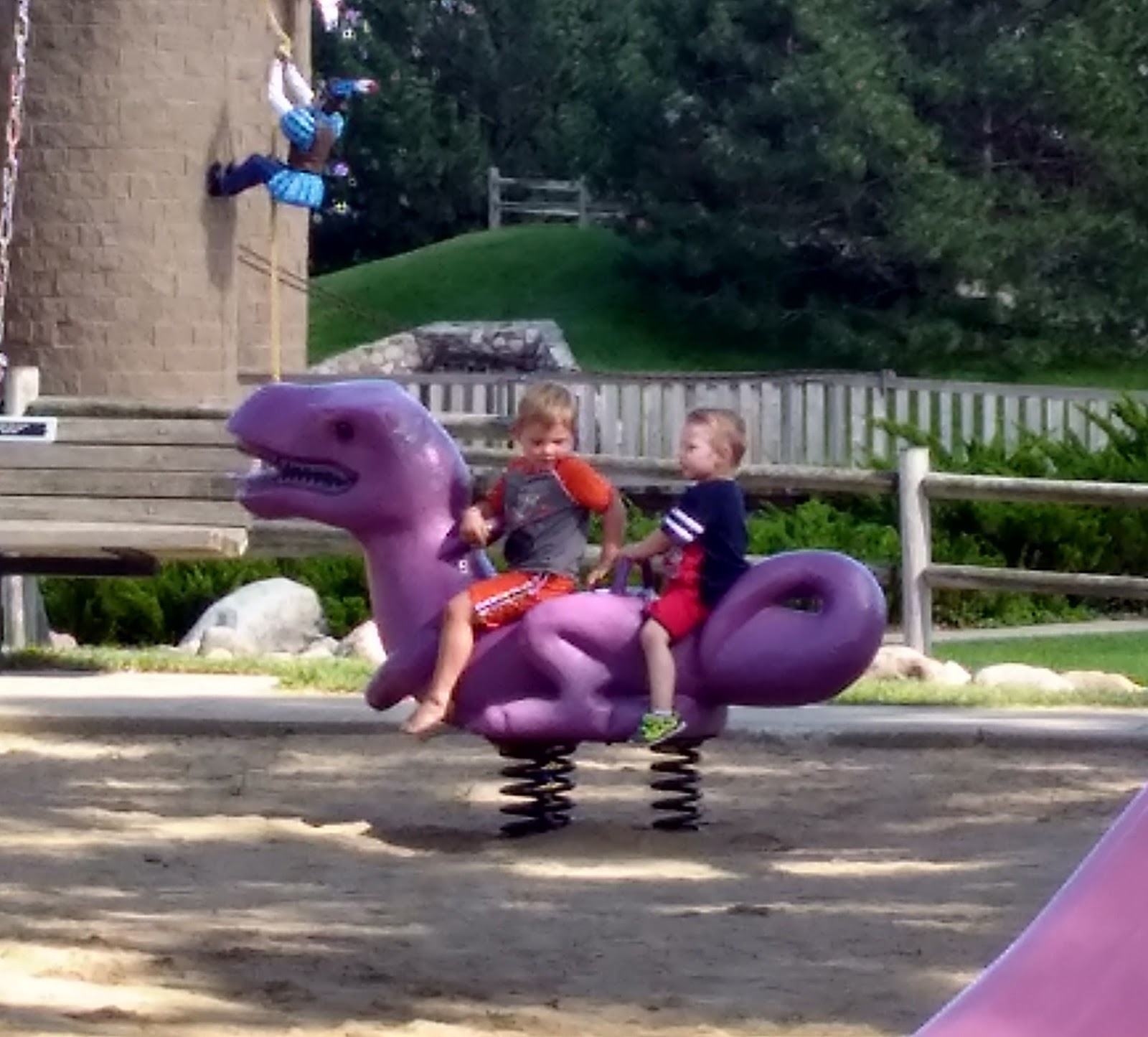 And, just like that, they became instant buddies! His name was Corbin. They played hide & seek, chase, went down the slides together, rode the dinosaur, etc. While they were running wildly, we heard Ramsey exclaim, "We are boys!!!". Later, when they had calmed down a bit, I heard Corbin ask Ramsey, "so, what do you want to do when you grow up?" Such diverse conversations and notations with these little ones!